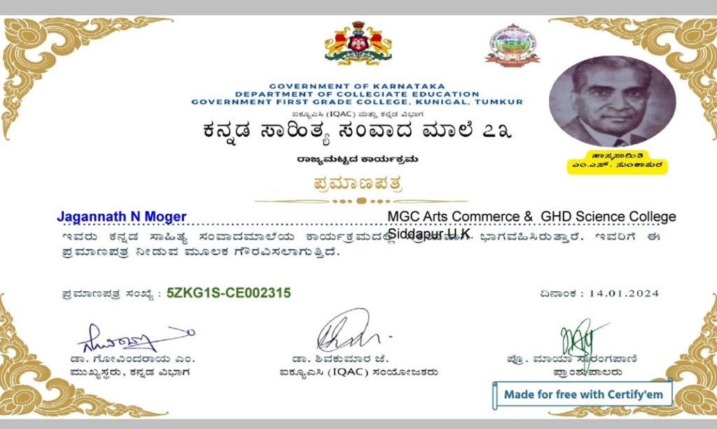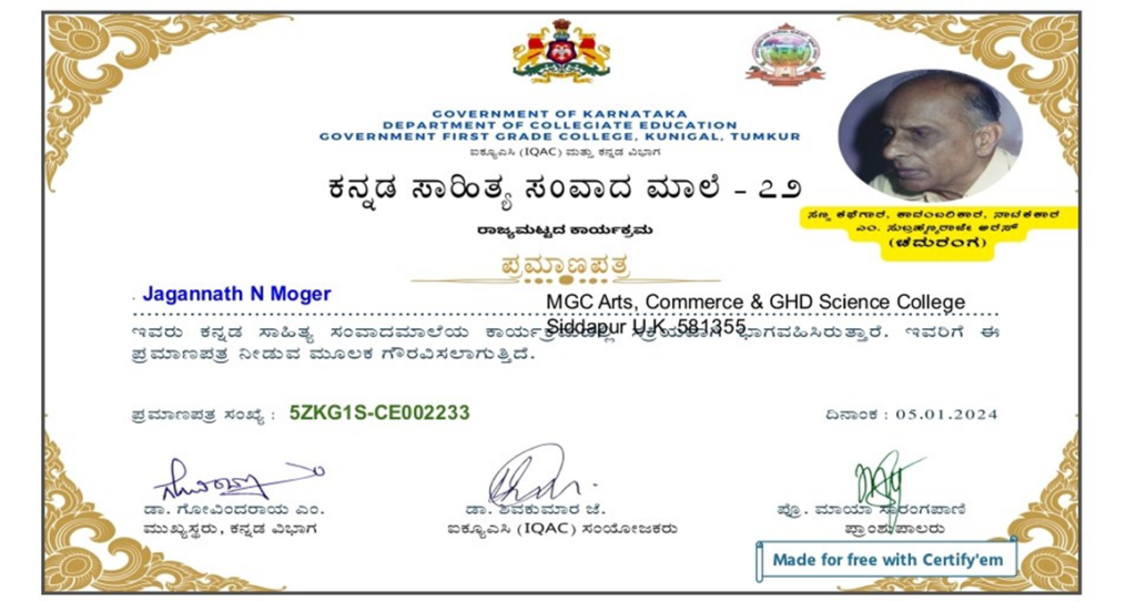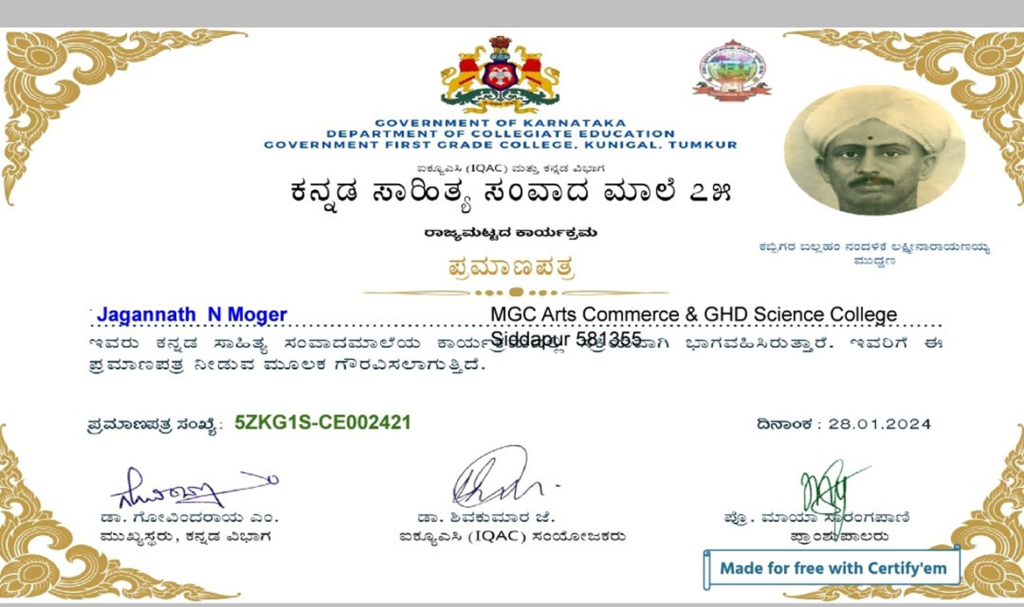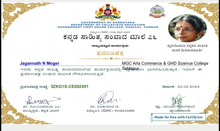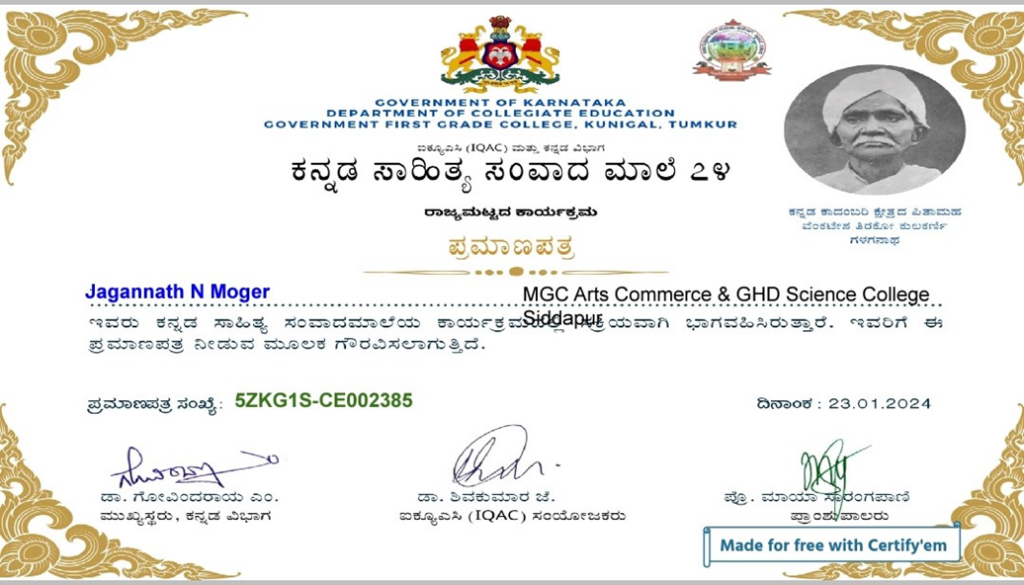 | 3 | 23-01-2024 | State Level Program | Kannada kadambari kshetrada pitamaha Venkatesh Tirako kulkarni Gagalganath | Participated | Government First Grade College, Kunigal, Tumkur |